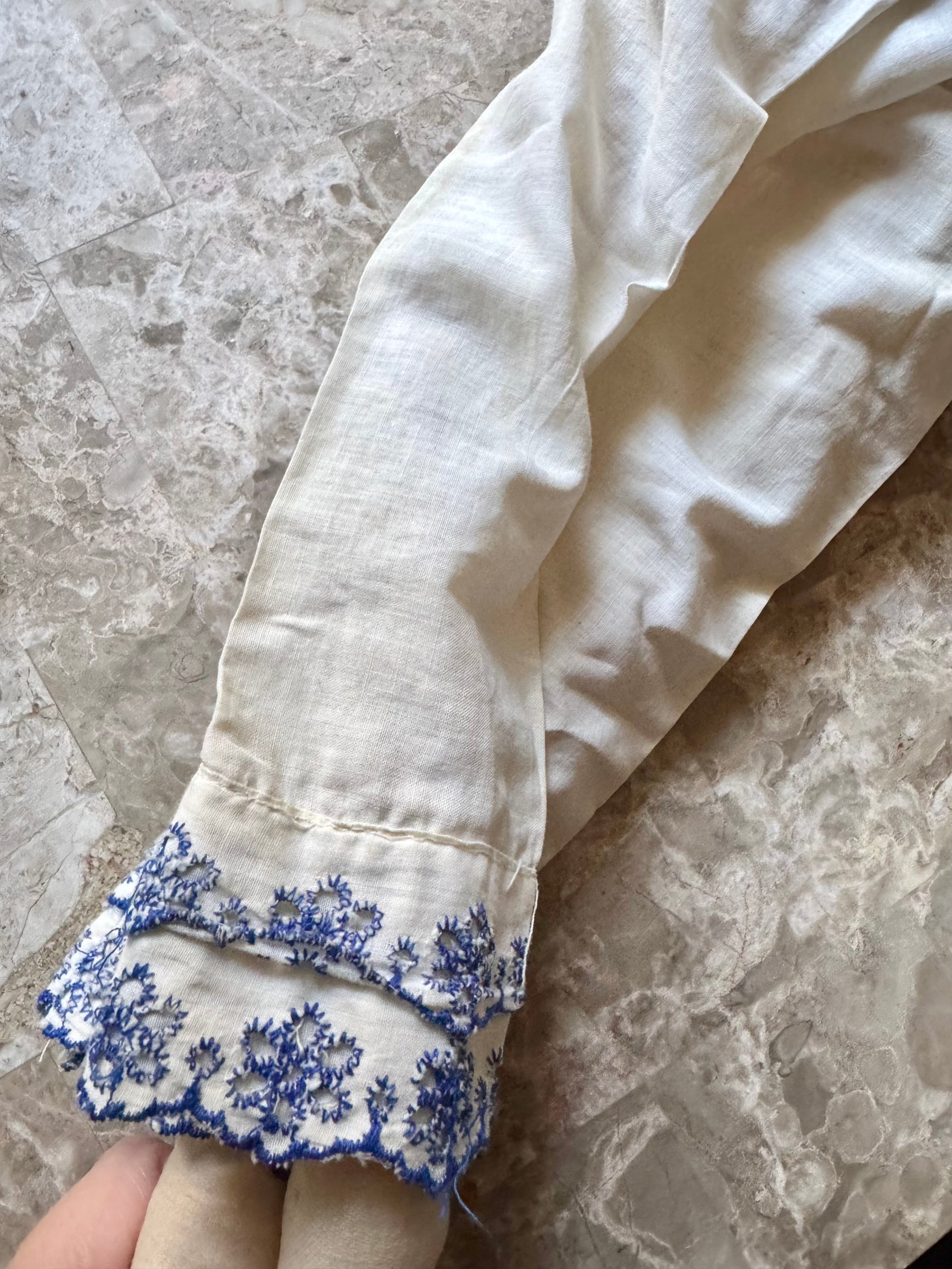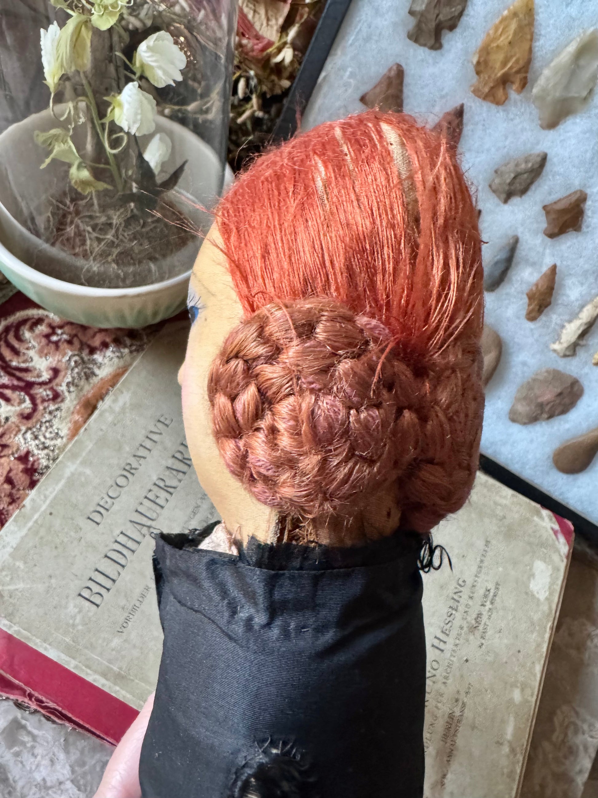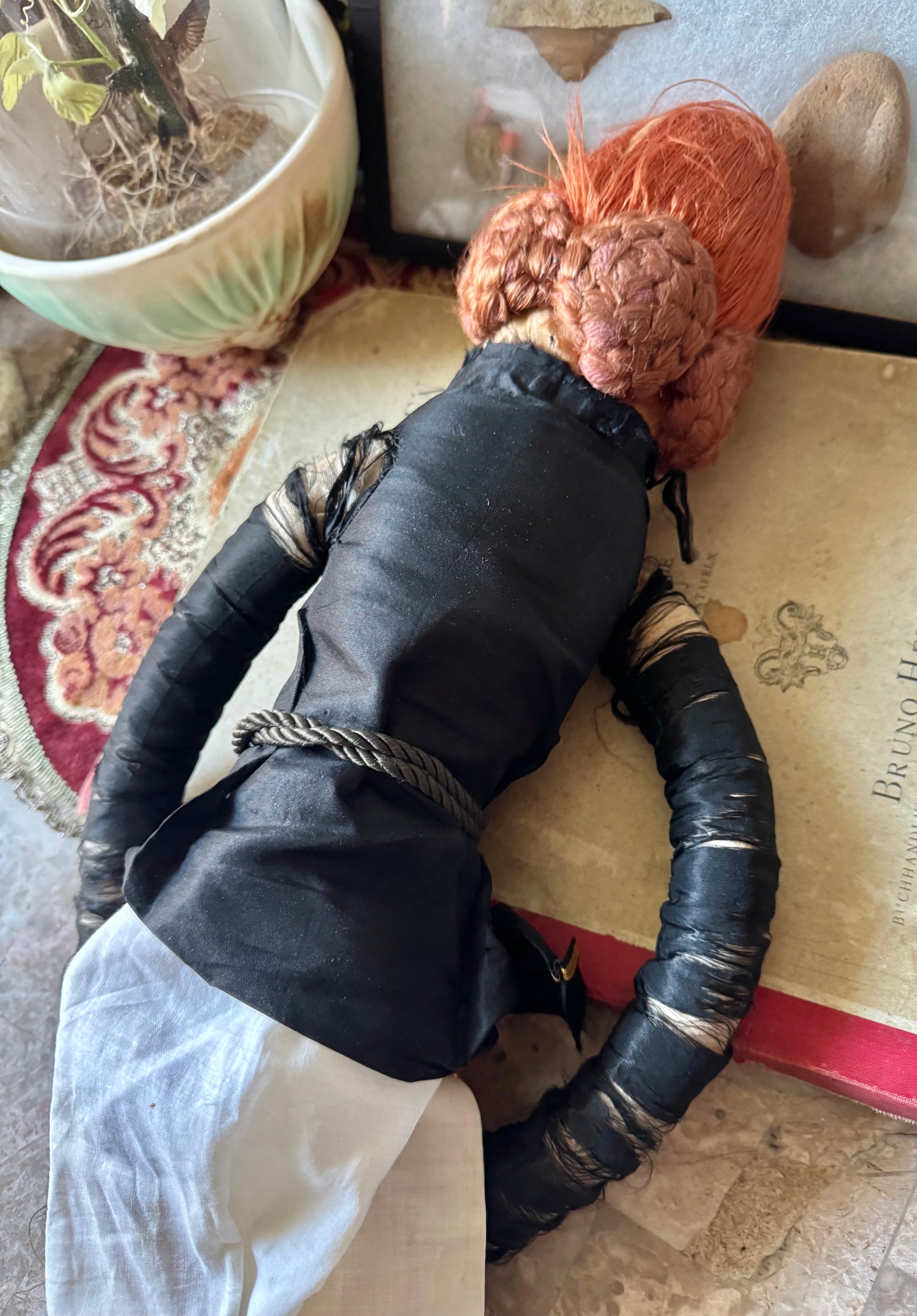Antique untagged 30.5 inch long boudoir doll with painted cloth face and stuffed cloth body. Unique color hair...guessing it was originally more red though faded and worn with age. She was found in her tattered black silk top though missing all her other clothing. I've pinned on her little vintage found pants and tied tassel trim rope along her waist. She's very age worn with spots and stains to face and body...very messy hair with loose and missing pieces and discoloration to her braid buns...lots of tattered tears and pinned areas to her top...yellowing and spotting to pants...slight aged storage scent too. *Please note close-up photos