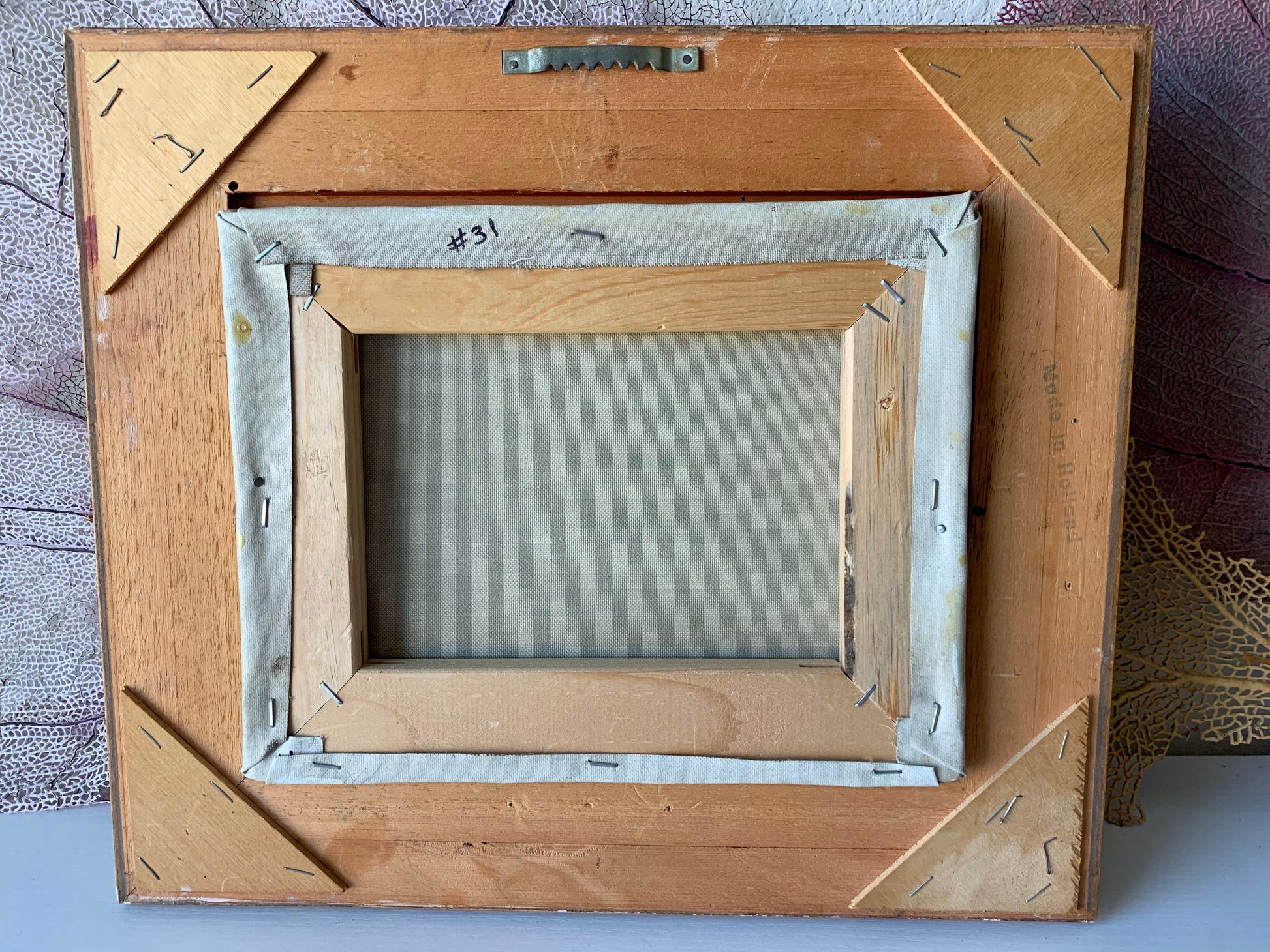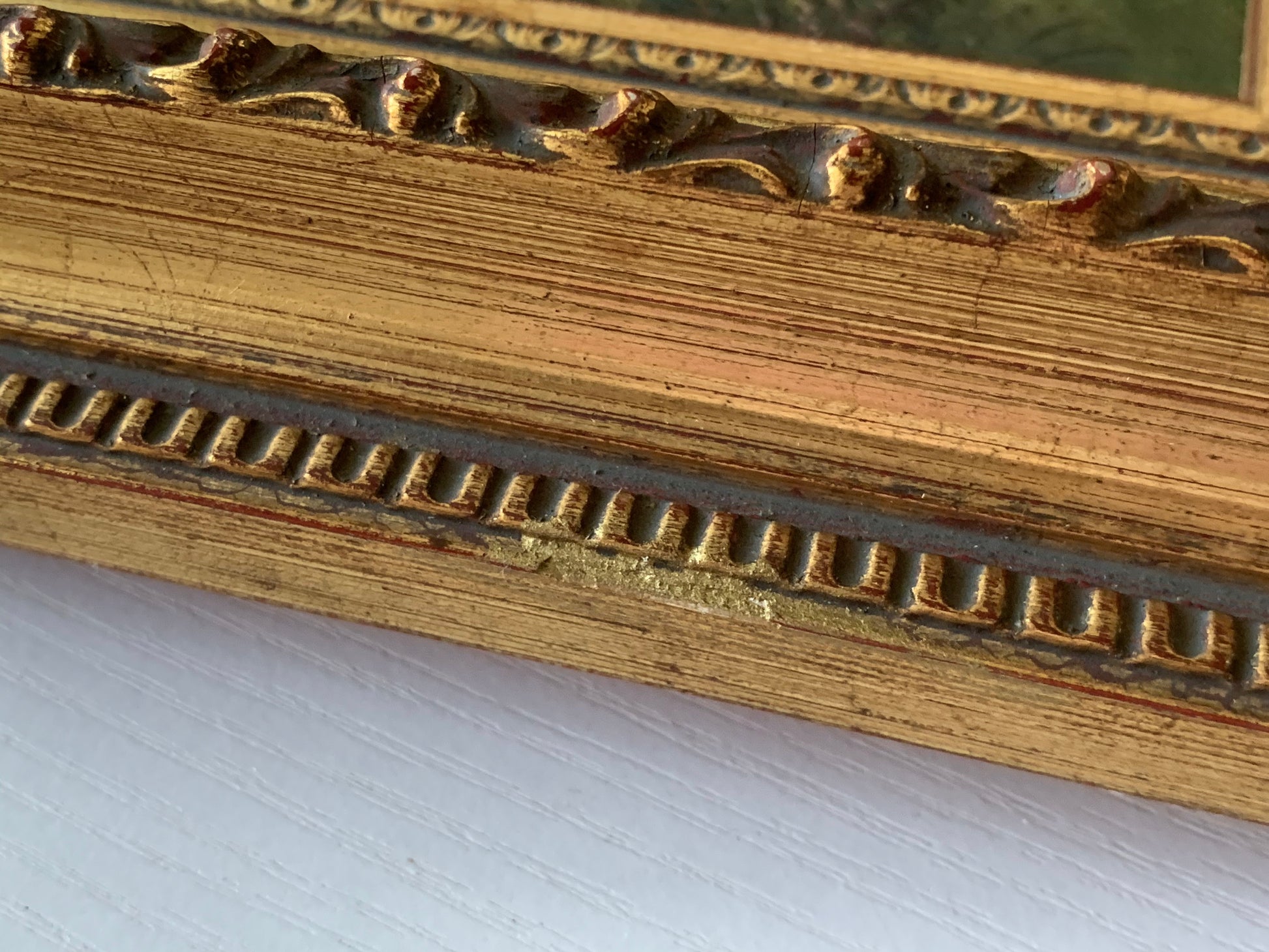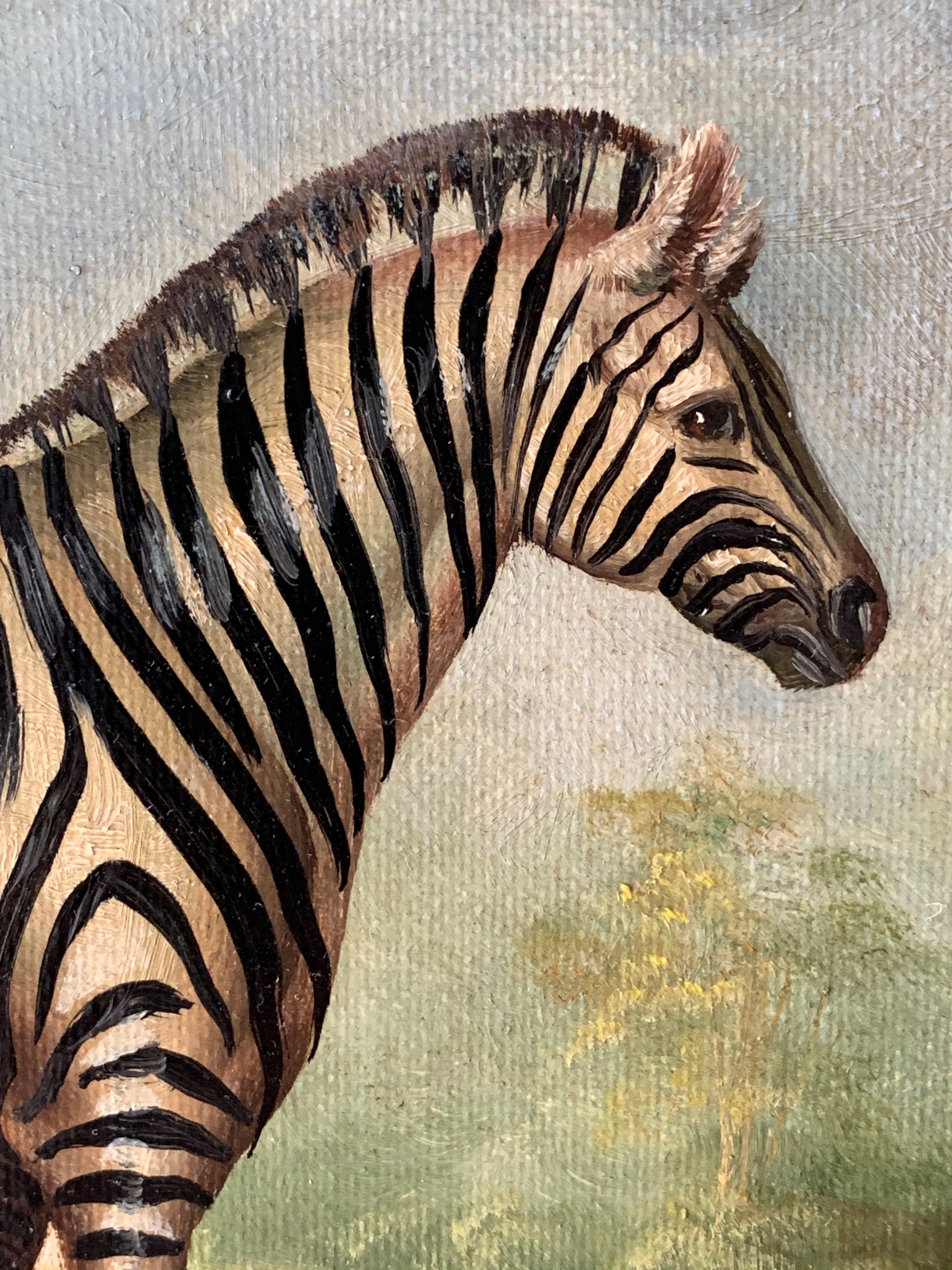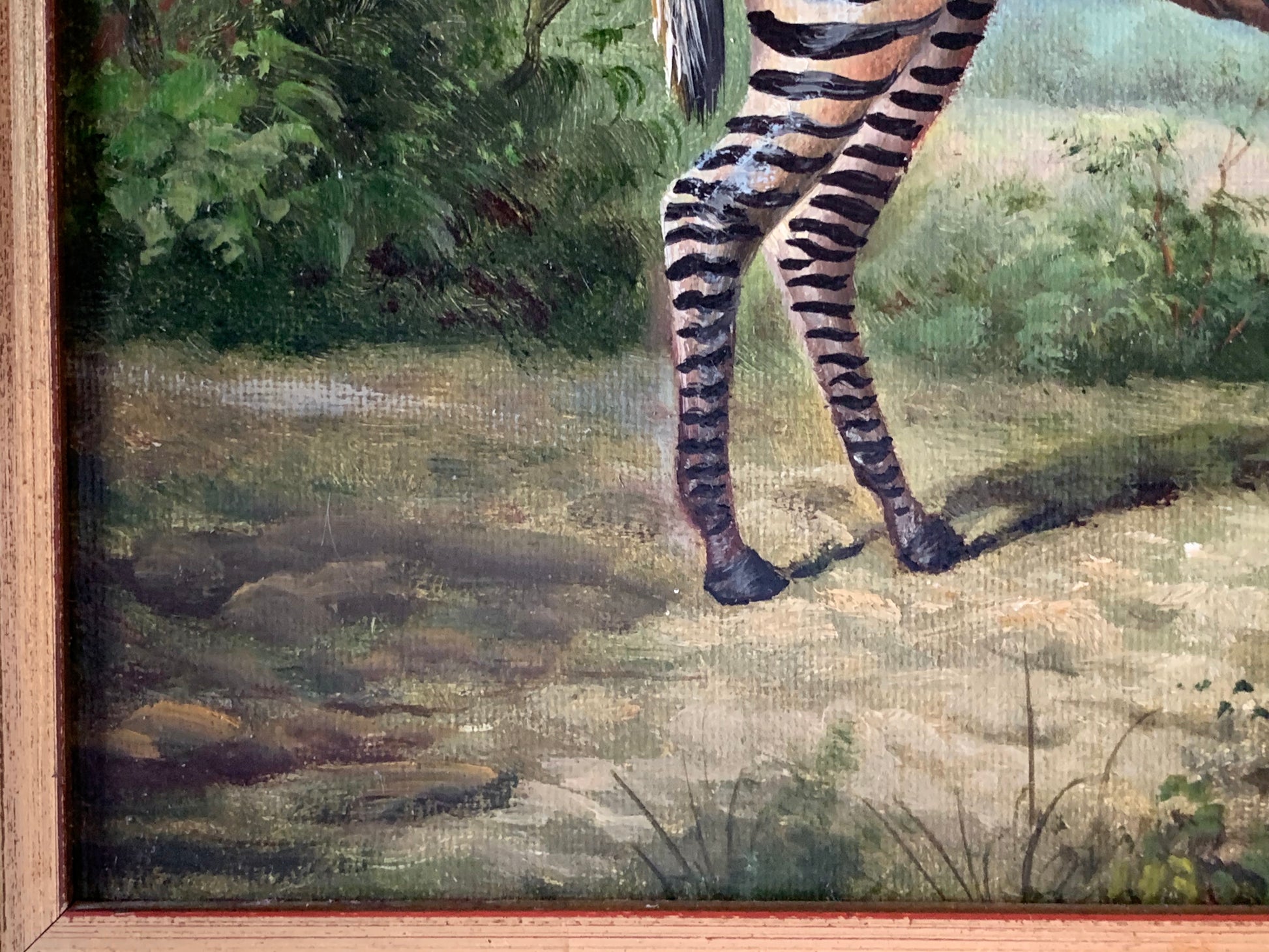 Vintage small original zebra painting on canvas. Signed lower right though hard to see since covered by frame so also unsure of age or if dated. Very nicely done and detailed with aged colors. Ornate aged gold wood frame with velvet inner lining. Framed is stamped Made in Holland on back. 12.5 x 14.5 inch total frame size and 8 x 10 inch canvas. Age wear to frame with spots, scratches and nicks. Tiny nail poking through to painting in top left corner though hard to see if actually puncturing the canvas(last photo). *Please note photos