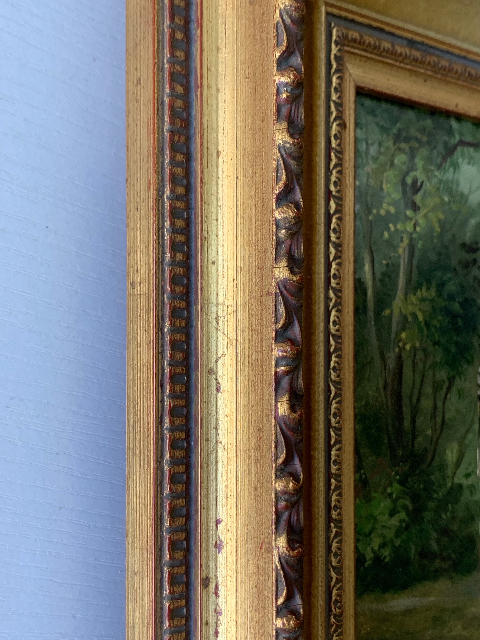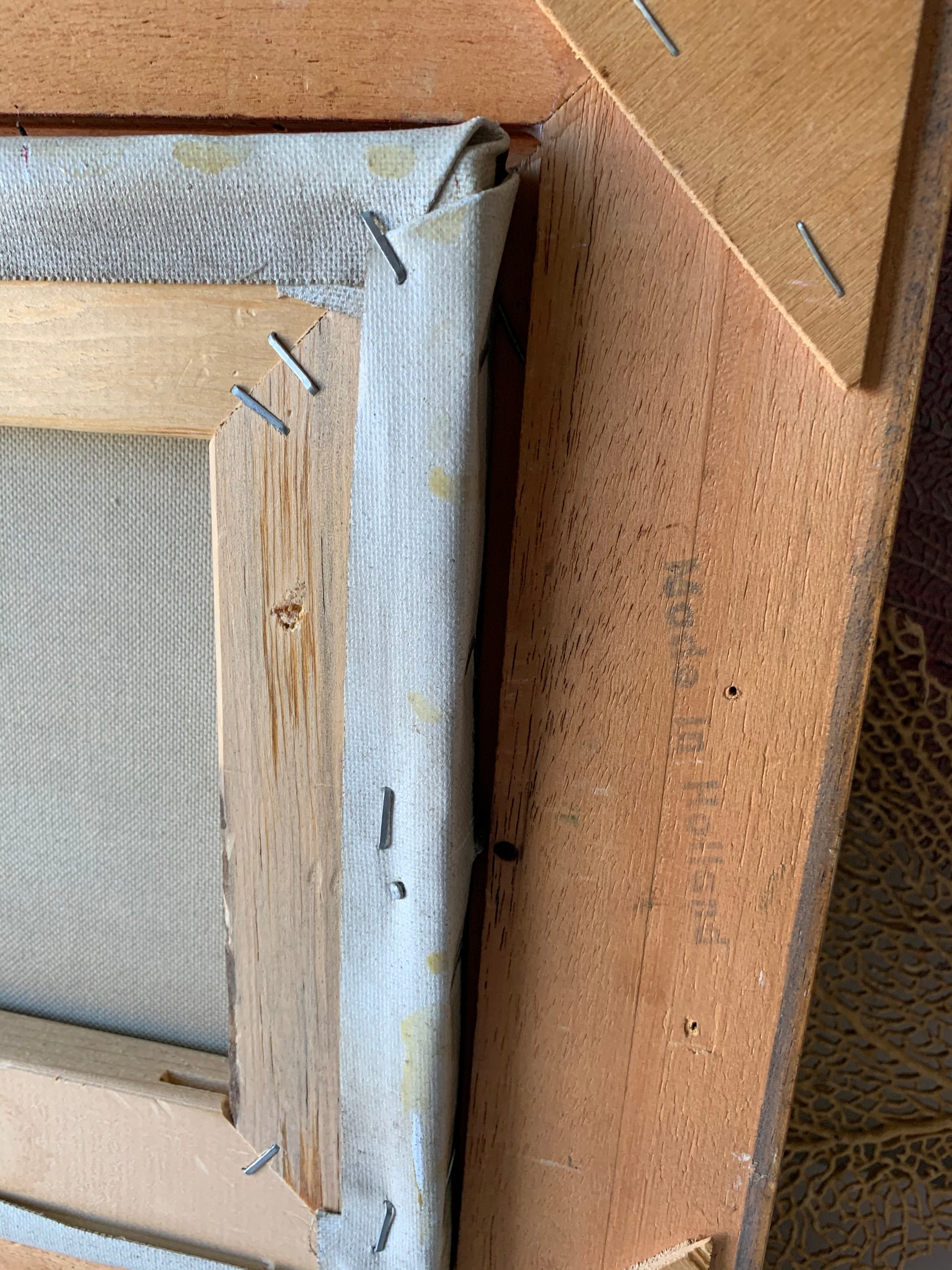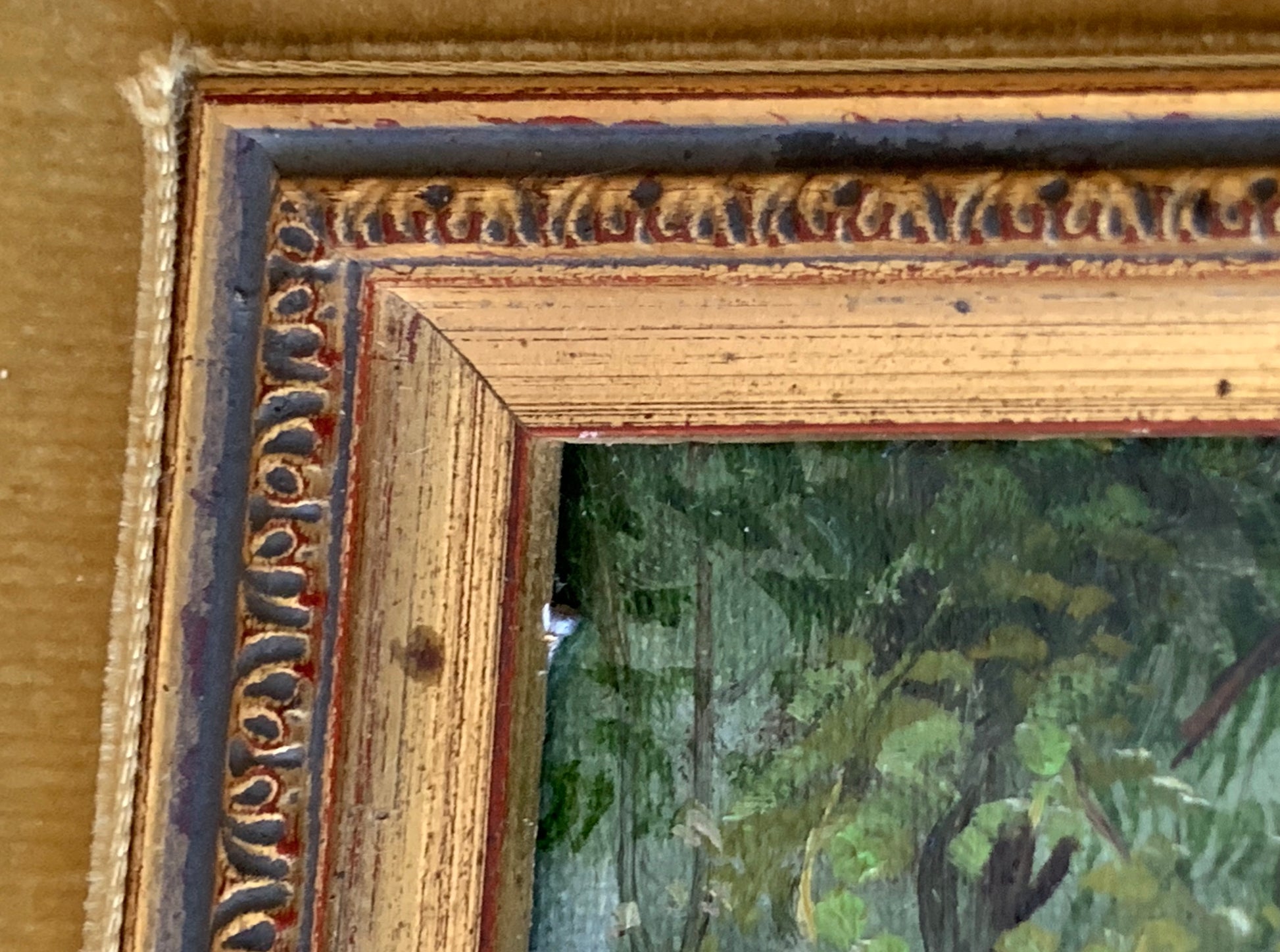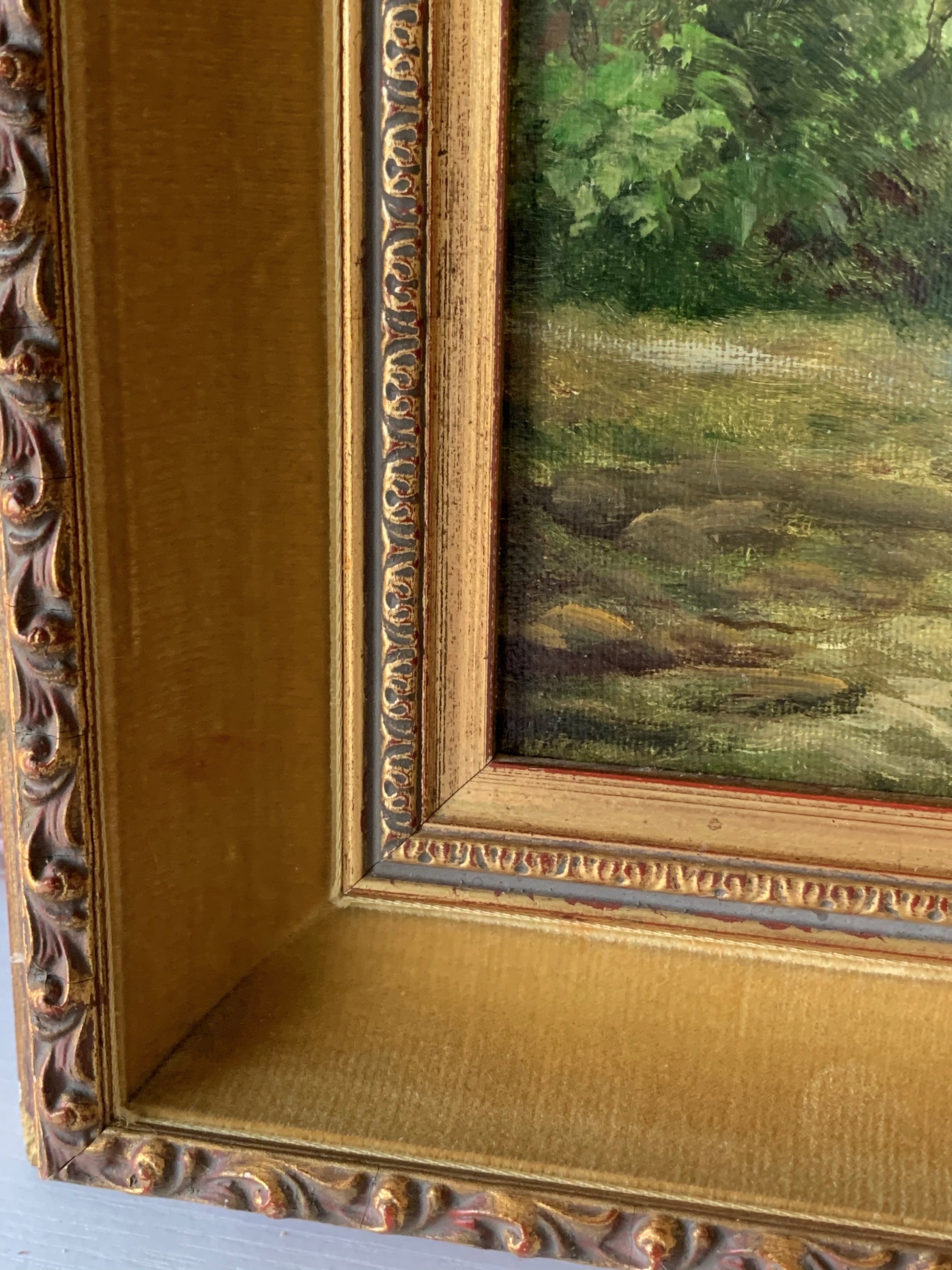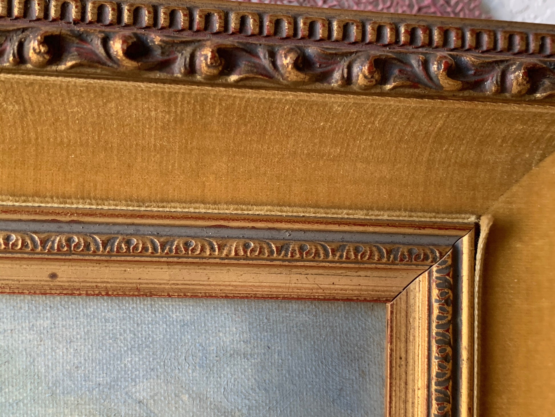 Vintage small original zebra painting on canvas. Signed lower right though hard to see since covered by frame so also unsure of age or if dated. Very nicely done and detailed with aged colors. Ornate aged gold wood frame with velvet inner lining. Framed is stamped Made in Holland on back. 12.5 x 14.5 inch total frame size and 8 x 10 inch canvas. Age wear to frame with spots, scratches and nicks. Tiny nail poking through to painting in top left corner though hard to see if actually puncturing the canvas(last photo). *Please note photos
