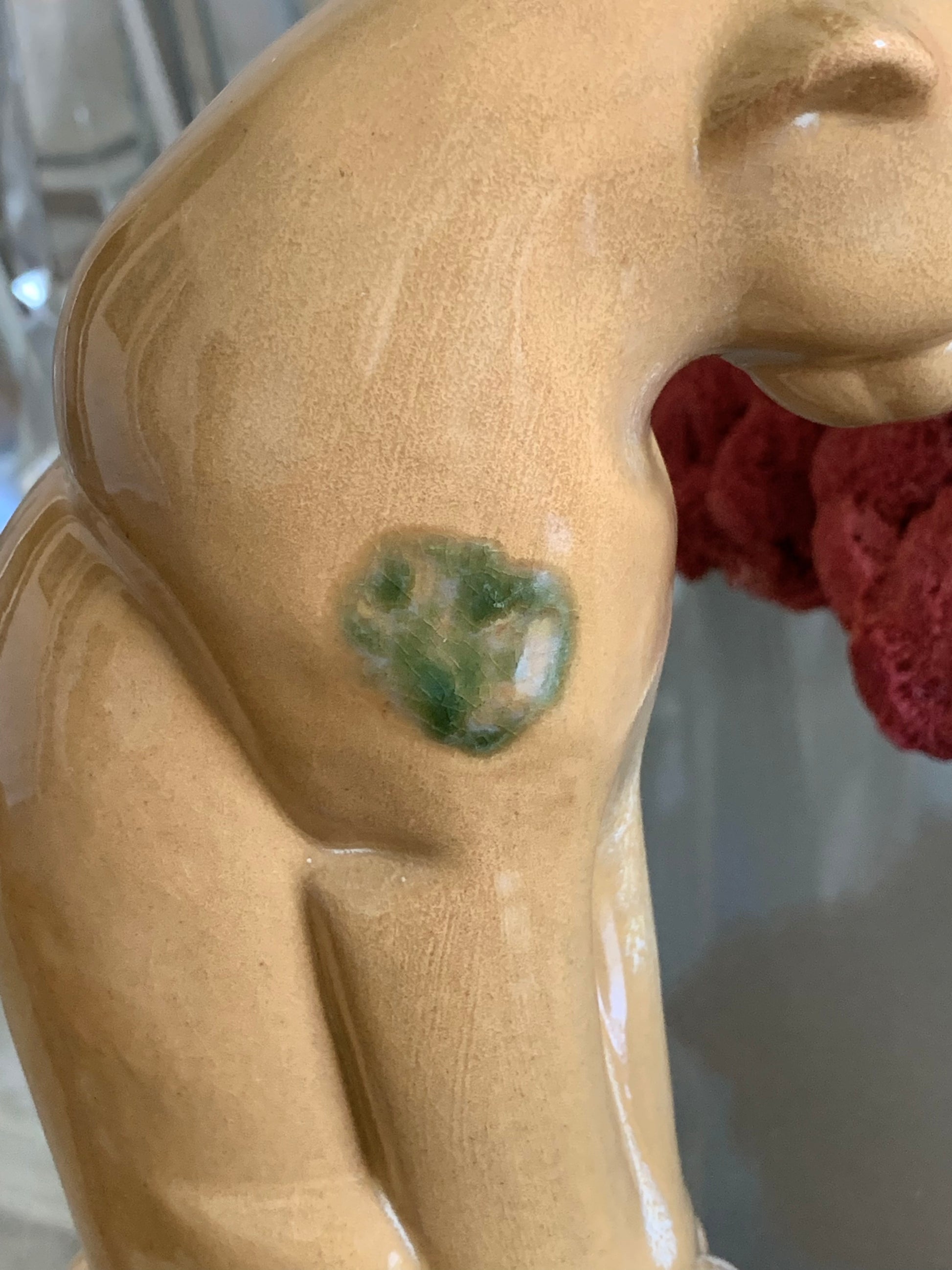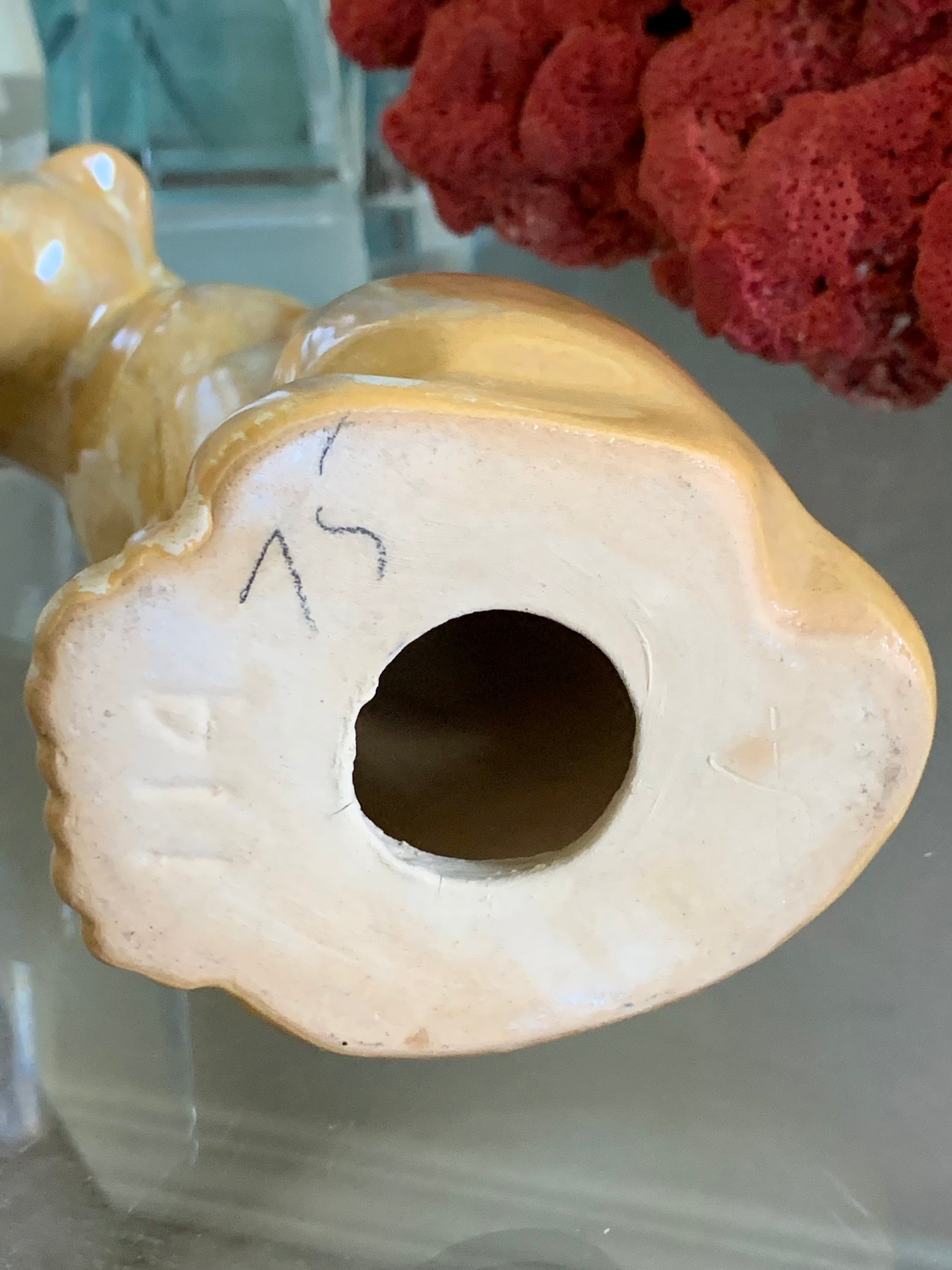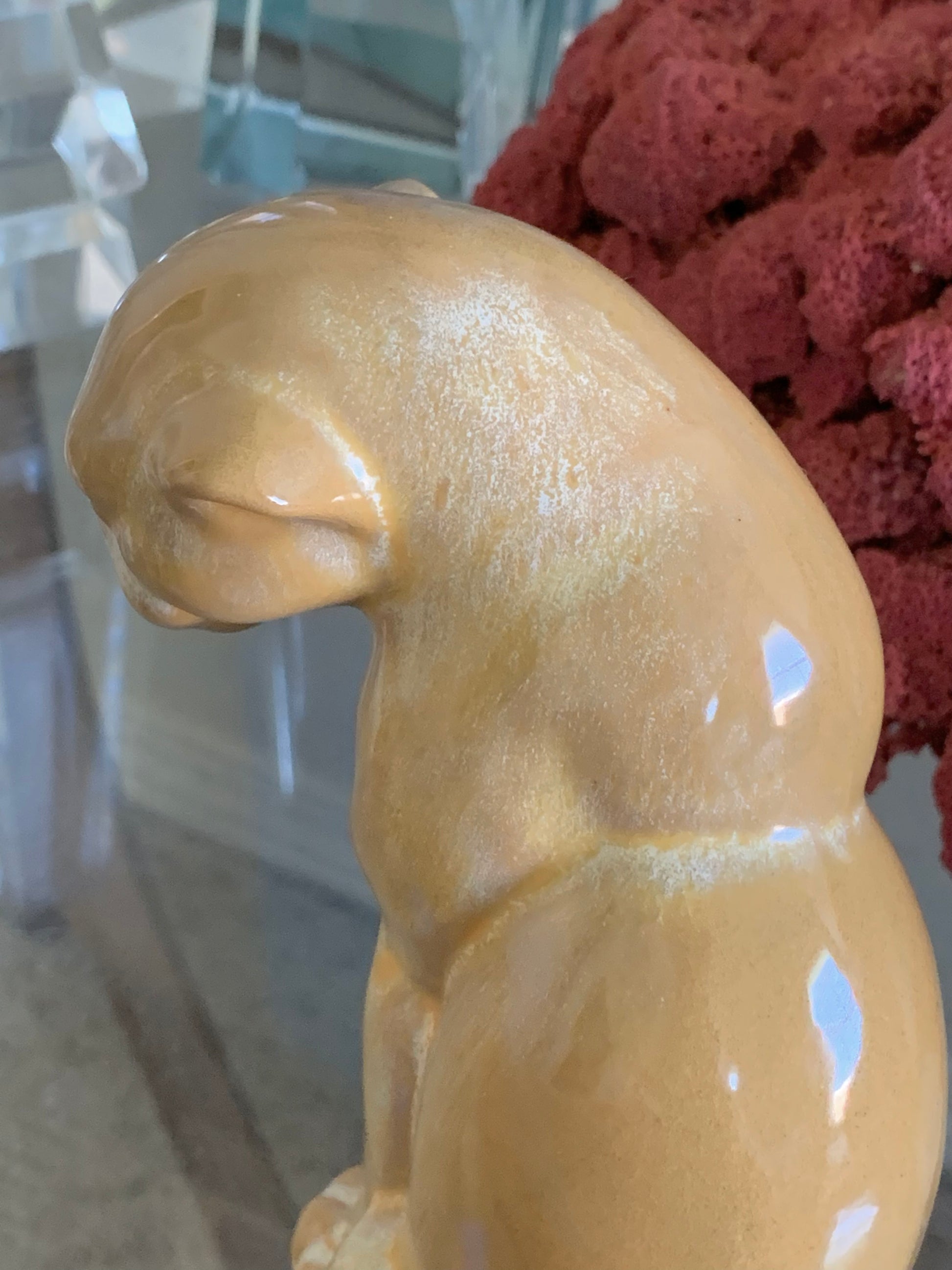 Vintage small Frankoma pottery puma or cat statue...marked 114 on the bottom. Lovely art deco style design with glazed golden finish. Has a unusual little glazed greenish spot on the side...so unsure if this was a factory blemish or intentional made. 6.75 inch tall. Some light scratches, spots and light crazing...marked numbers on bottom...tiny bump speck in tail crease(last photo). *Please note photos
