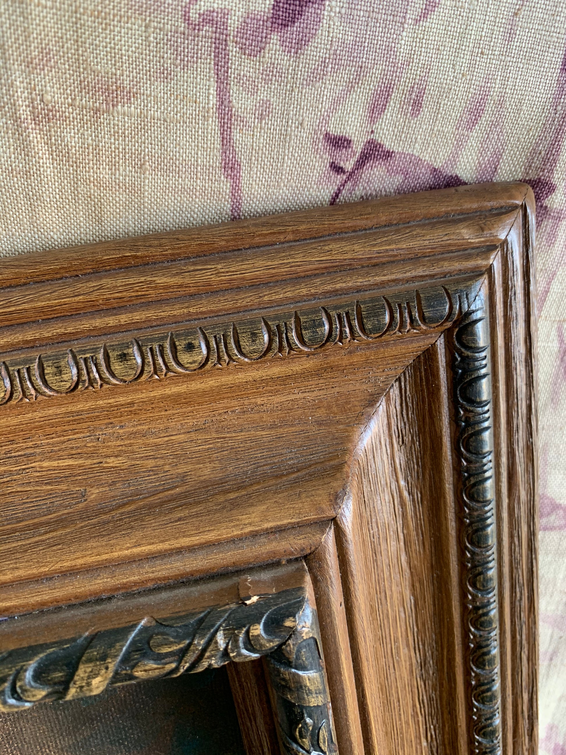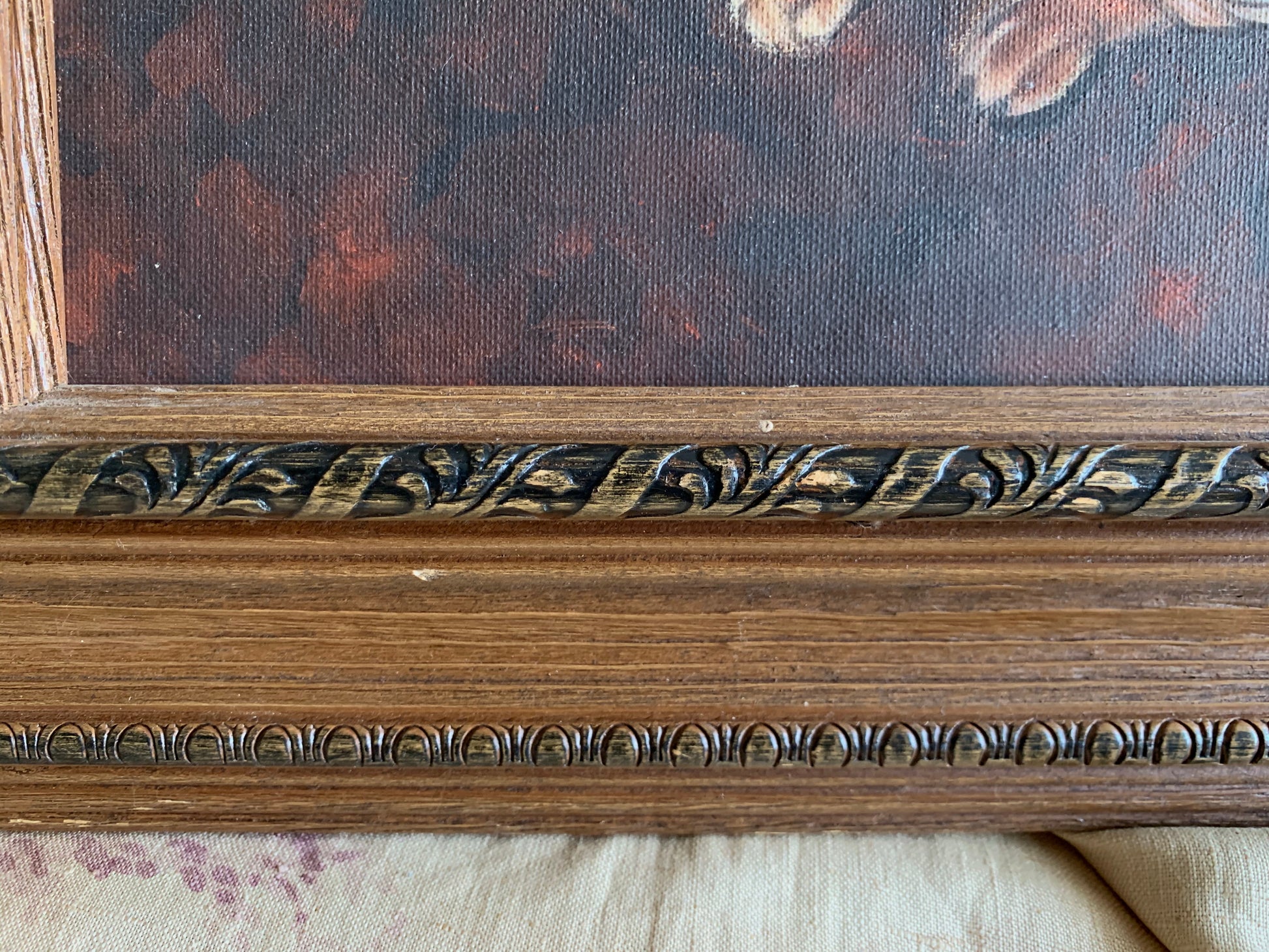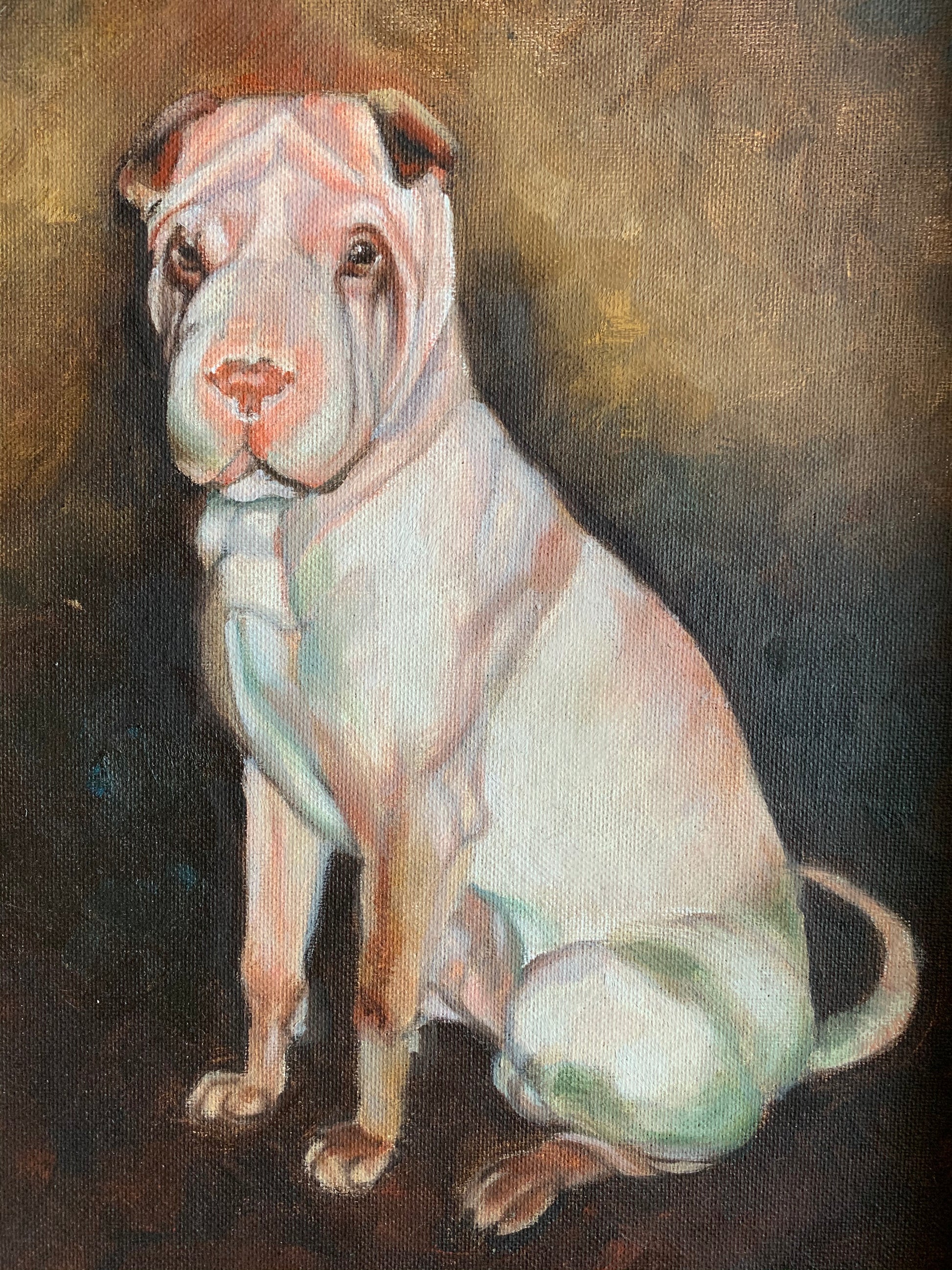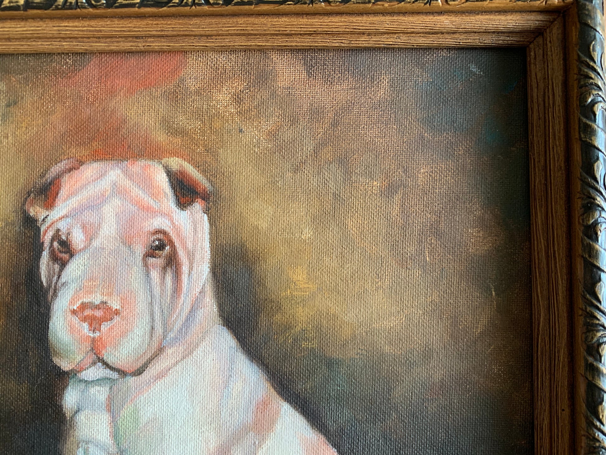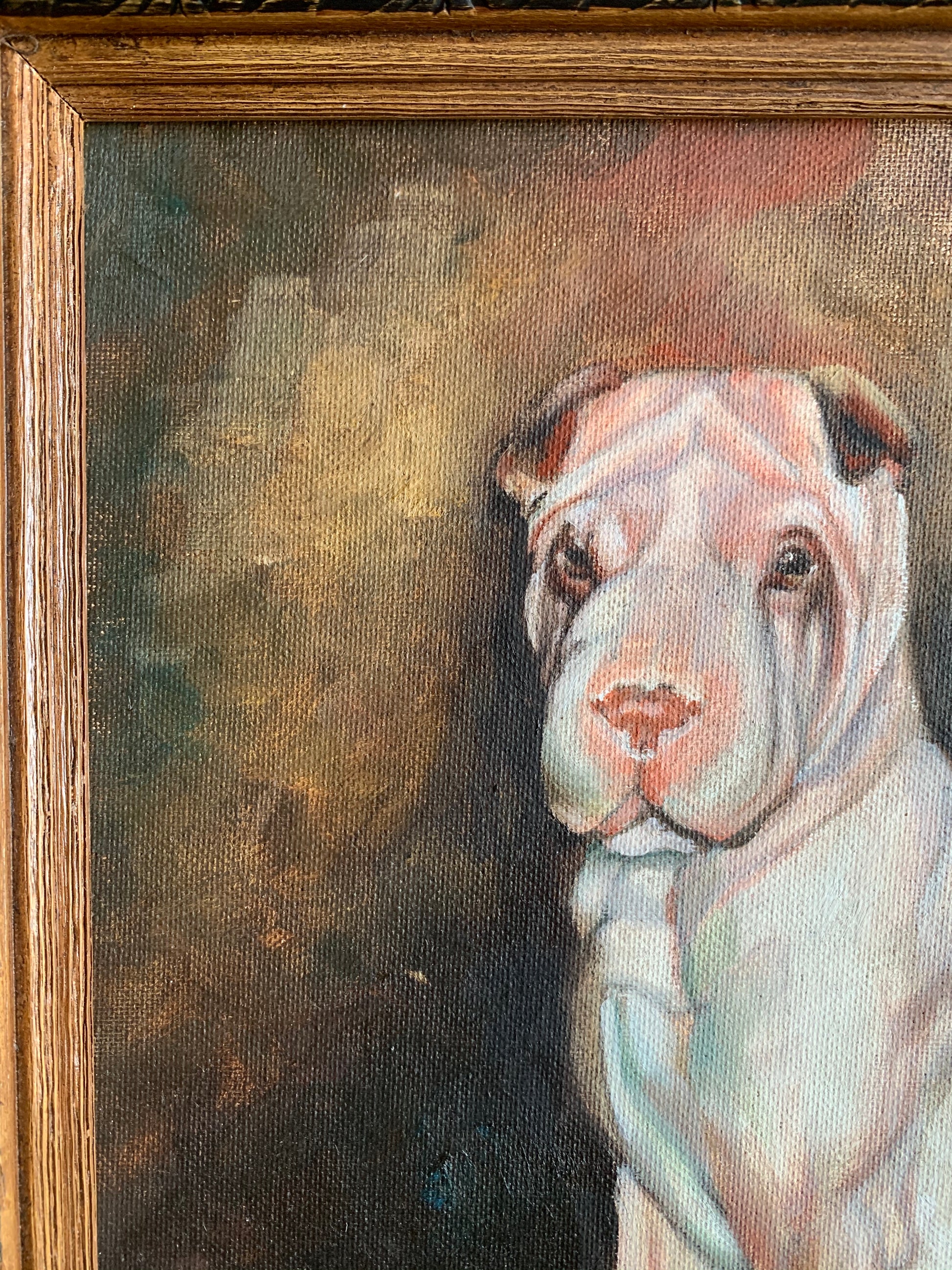 Vintage framed original painting on canvas signed Rebecca Hinds. Undated. Wonderfully done portrait of a bulldog or Shar Pei looking pooch. Decorative wood frame with hanging wire on back. Some little spots and scratches to painting surface...scratches and worn finish to frame with looks like a little protruding nail split along top right corner(last photo). *Please note photos