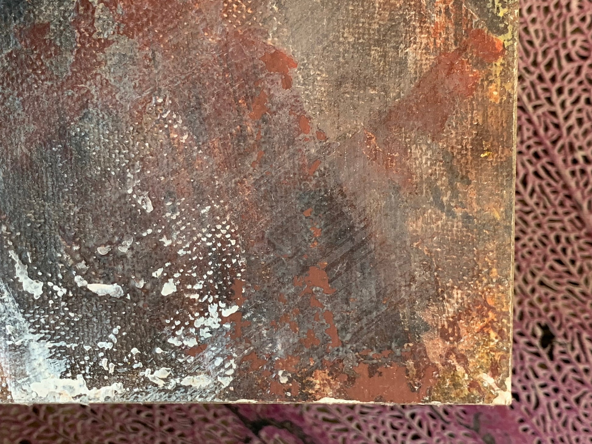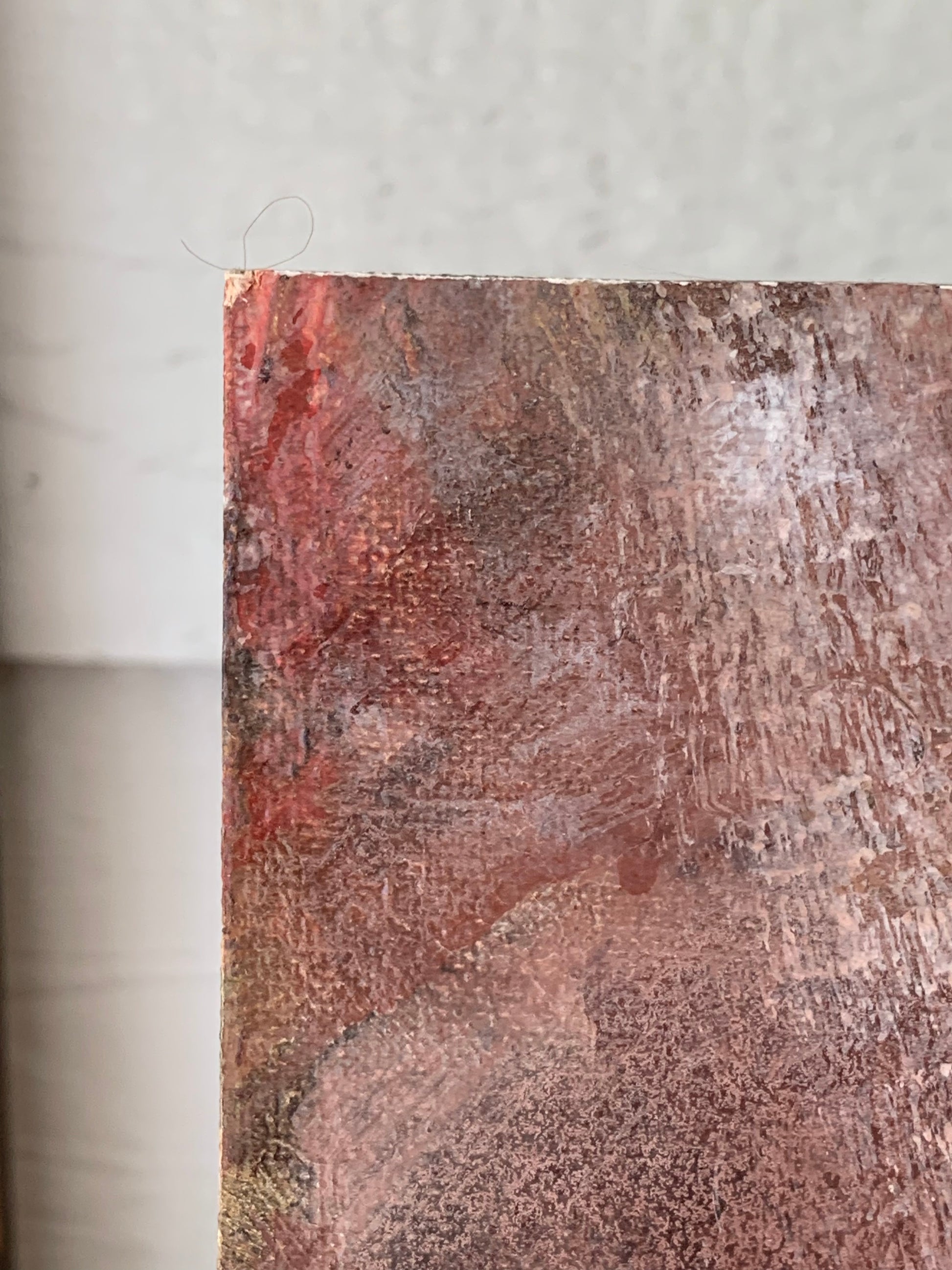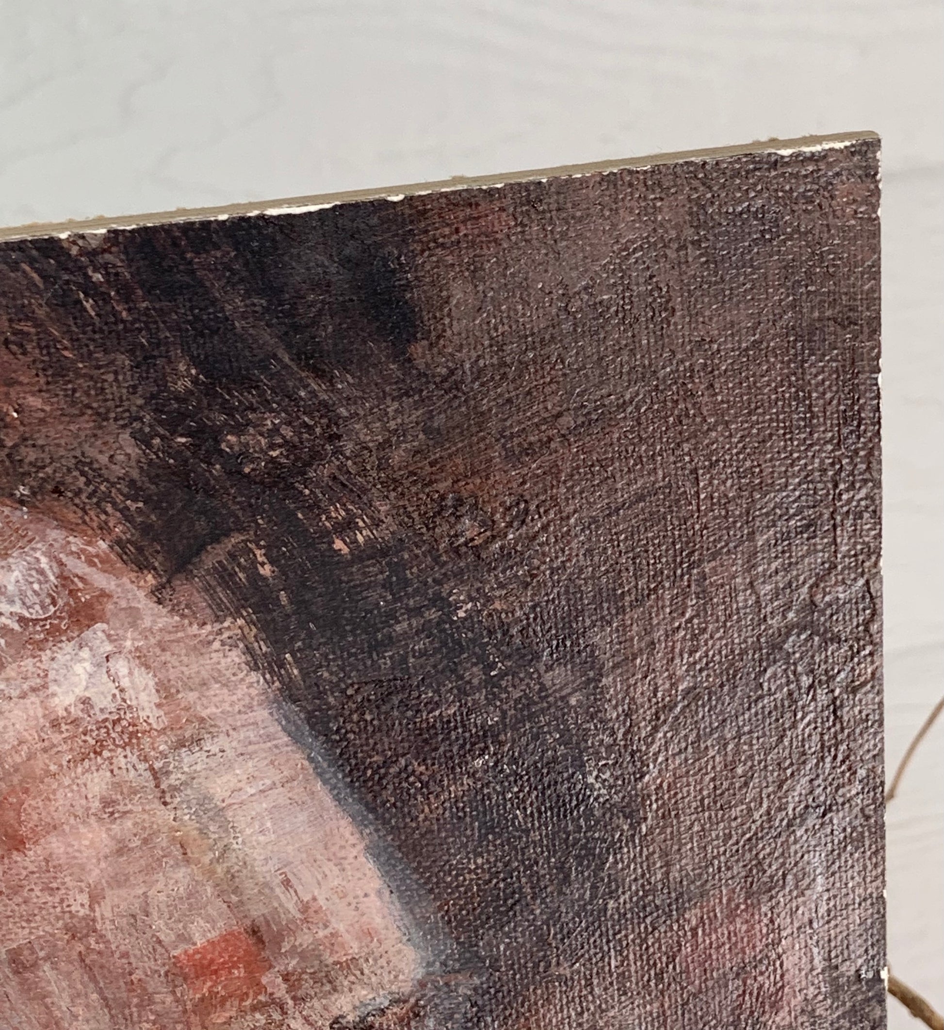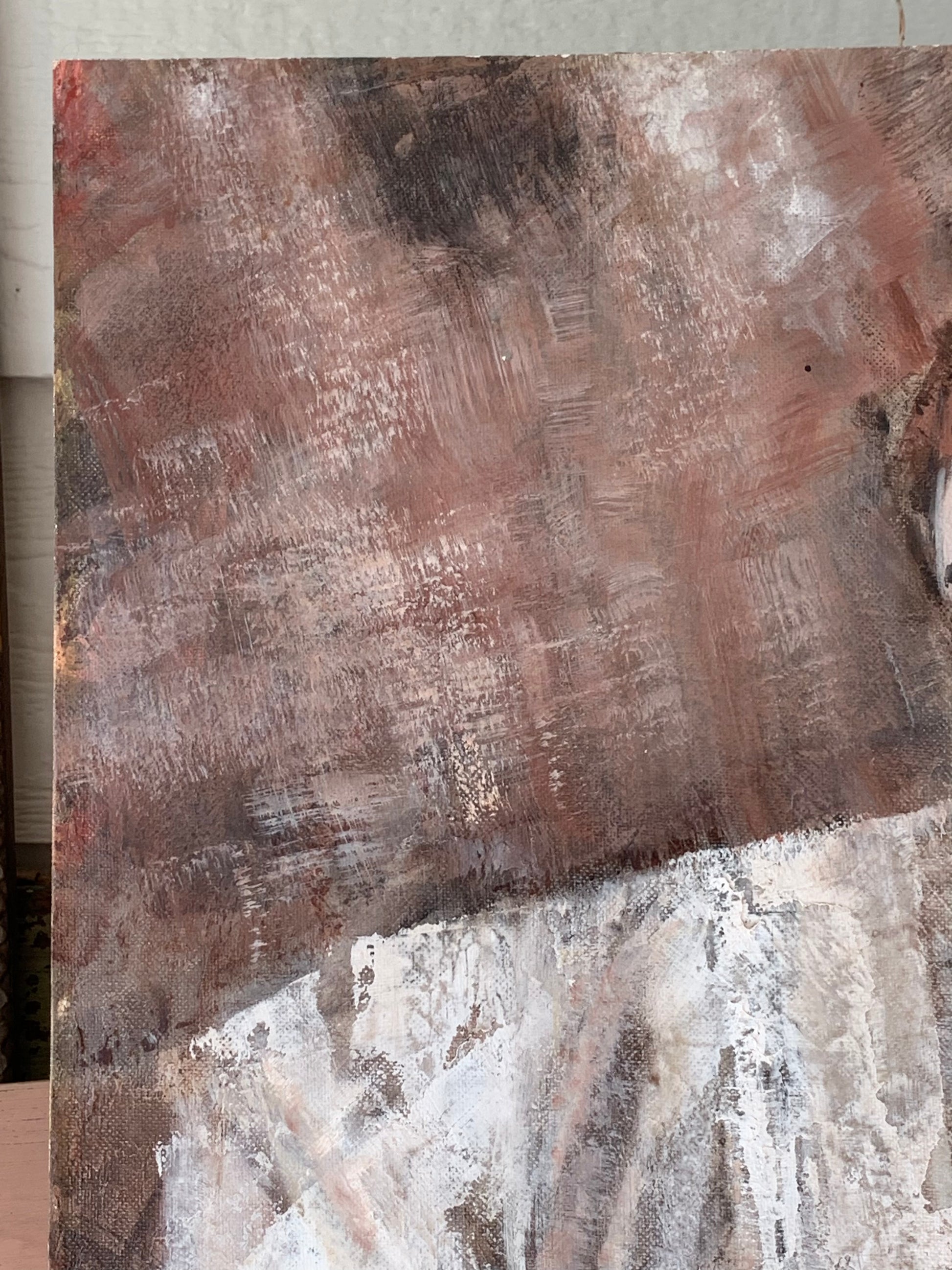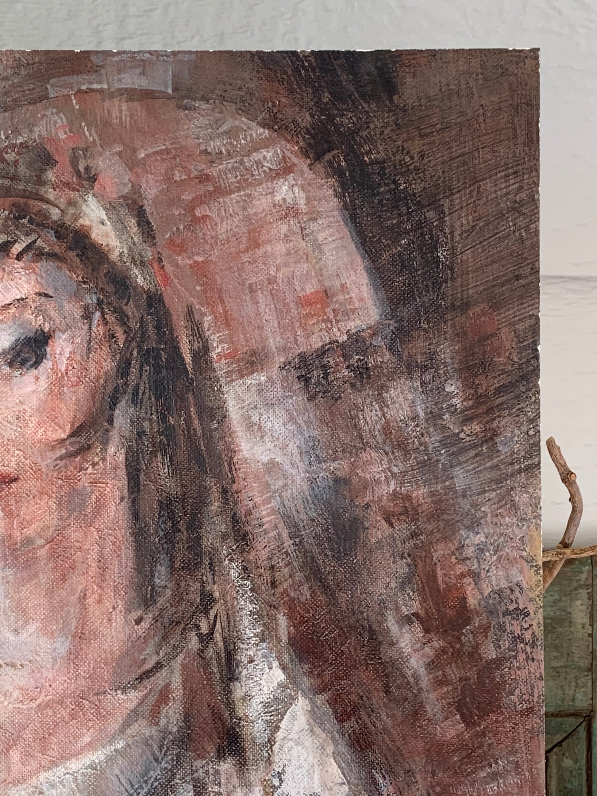 Vintage undated original mid century lady portrait painting...from a local collector's estate. Looks like thin canvas on thick matte-type board. Unsigned though looks like in the design of Nicolai Fechin. Very sultry with wonderful brush-work. Unframed without hanging wire. Some little spots along the face and neck though unsure if age wear or intentionally mad.e Shows age and storage wear with some scratches, wear along edges from where frame and little nick along side edge...some staining along the backside. *Please note photos